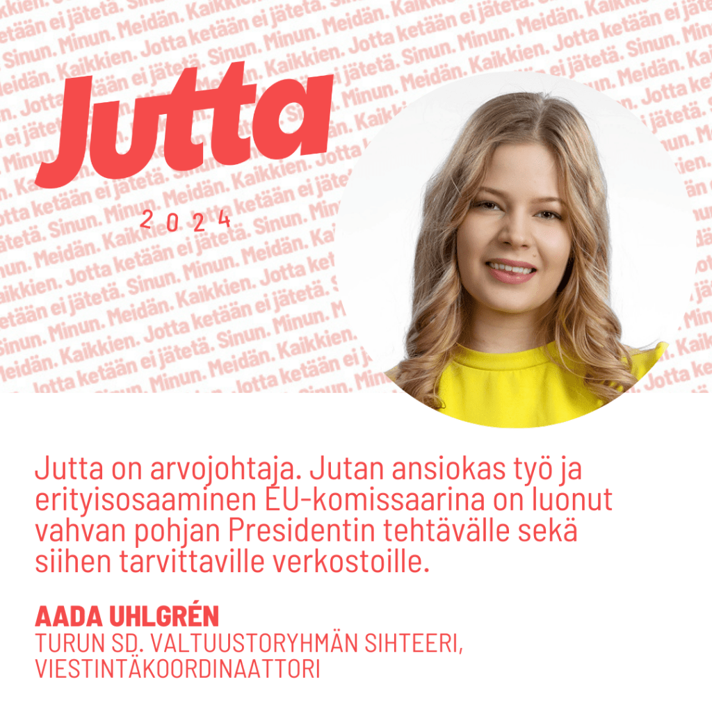 Jutta on arvojohtaja. Kampanjan slogan ”Jotta ketään ei jätetä” kuvastaa hyvin Jutan edustamia arvoja. Ajassa, jossa naapurimaamme käy sotaa tarvitaan Presidentti, jolla on paineensietokykyä tilanteessa kuin tilanteessa. Ajassa, jossa vastakkainasettelu kasvaa niin kansallisesti kuin kansainvälisesti mitattuna tarvitaan Presidentti, joka osaa omalla toiminnallaan osaa yhdistää kansaa poliittisen kartan jokaisesta suunnasta.